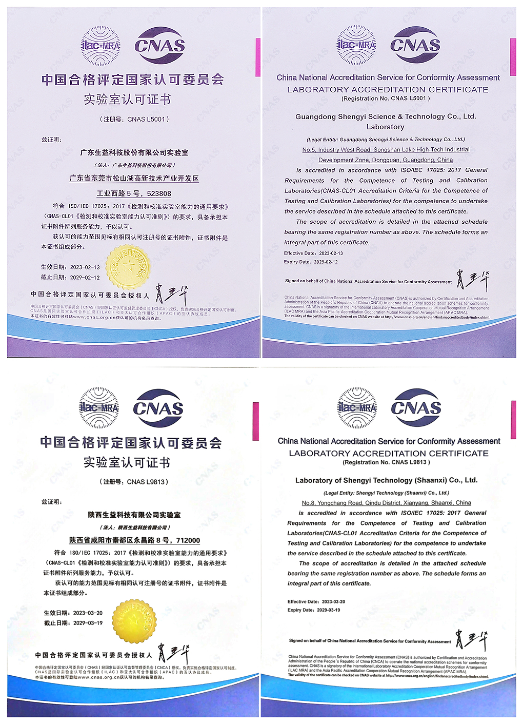 廣東生益實(shí)驗(yàn)室于2011年3月取得CNAS實(shí)驗(yàn)室資格;2012年5月取得CQC(China Quality Certification Centre)現(xiàn)場(chǎng)認(rèn)可實(shí)驗(yàn)室。(右圖為CNAS2023年3月-2029年3月實(shí)驗(yàn)室認(rèn)可證書(shū))